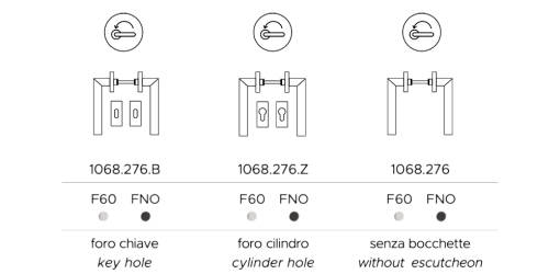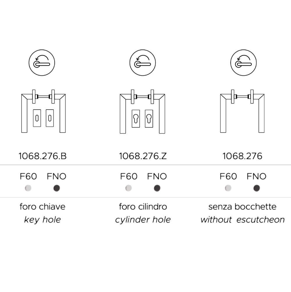 Passando alle opzioni di personalizzazione, il modello 1068.276 risponde alle esigenze dell'interior design contemporaneo attraverso le finiture Inox Satinato (F60) e Nero Opaco ( FNO). In particolare, è possibile scegliere tra diverse configurazioni di foratura: la versione con foro chiave, quella con foro cilindro e la variante senza bocchette.