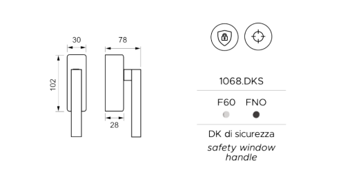 Per quanto riguarda invece l'ergonomia, le misure sono state studiate accuratamente per garantire un ingombro razionale e bilanciato. Nello specifico, la rosetta di sicurezza presenta un'altezza di 102 mm e una larghezza di 30 mm. Parallelamente, la sporgenza totale della maniglia è di 78 mm, mentre la distanza tra la rosetta e l'impugnatura è di 28 mm. Occorre sottolineare che tali proporzioni assicurano una presa solida e confortevole anche su infissi di grandi dimensioni o caratterizzati da profili particolarmente pesanti.