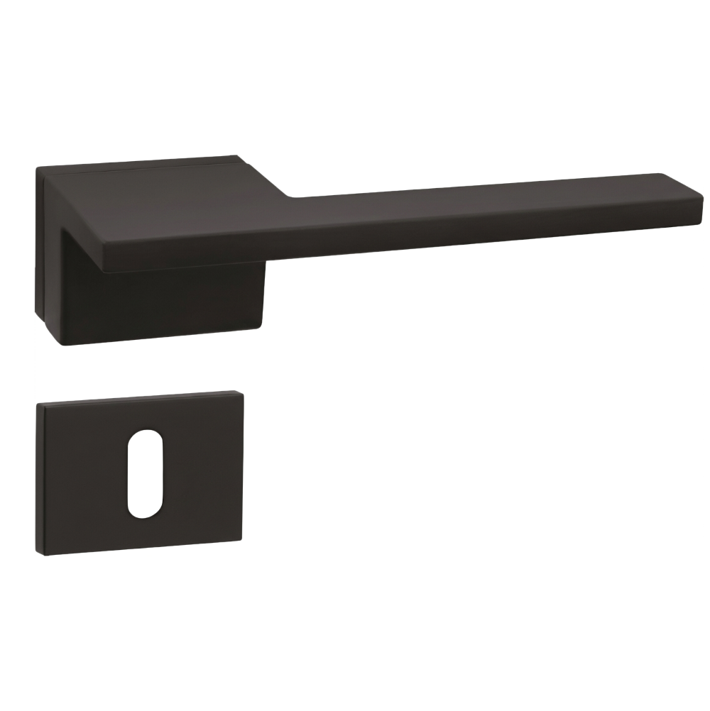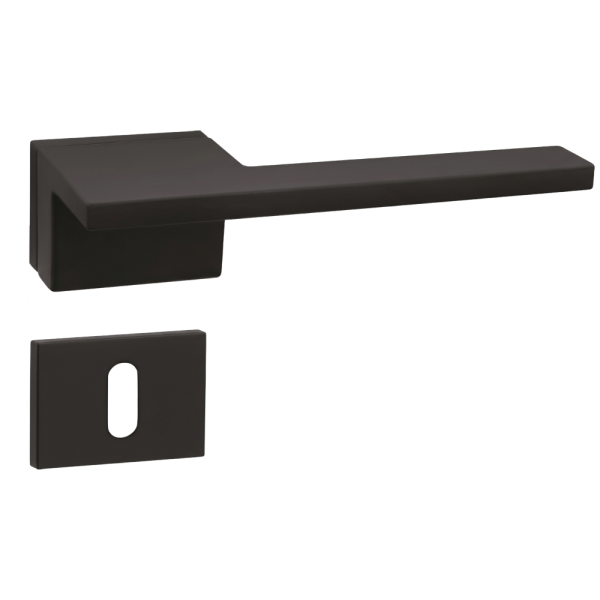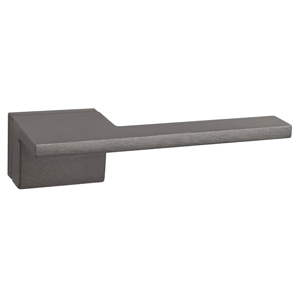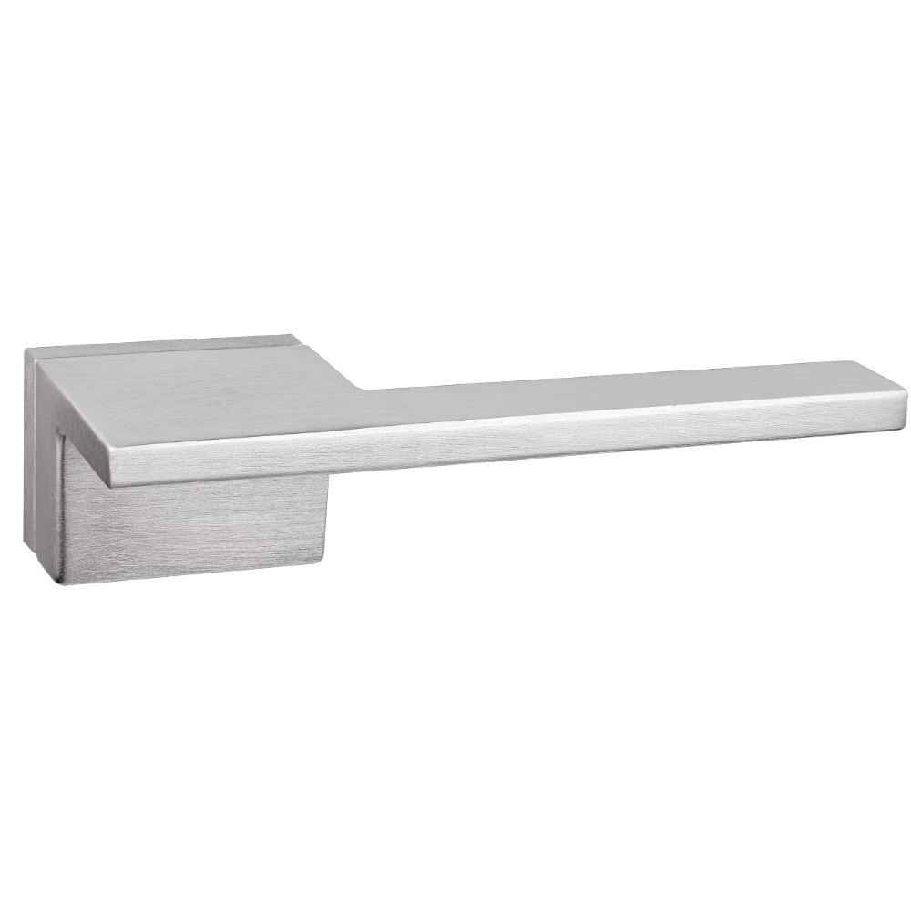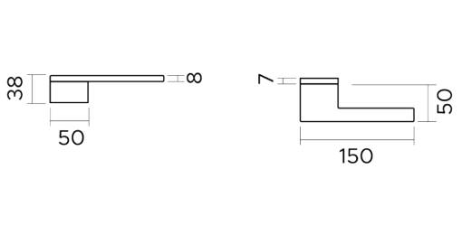 In secondo luogo, la particolarità fondamentale di questa versione risiede nelle sue specifiche dimensionali e nella configurazione della rosetta ultra-sottile. La base rettangolare misura infatti 50 mm di larghezza per 38 mm di altezza, offrendo una presenza visiva importante sul pannello della porta. Effettivamente, il dettaglio tecnico più rilevante è lo spessore della rosetta di soli 7 mm, che permette alla maniglia di aderire con discrezione alla superficie del serramento. Inoltre, l’impugnatura presenta una lunghezza complessiva di 150 mm, offrendo una leva eccellente e un comfort d’uso superiore. In questo modo, la sezione di presa da 8 mm assicura una manovrabilità leggera ma estremamente sicura. Per di più, la profondità totale di 50 mm garantisce un bilanciamento ideale tra ergonomia e ingombro spaziale.
