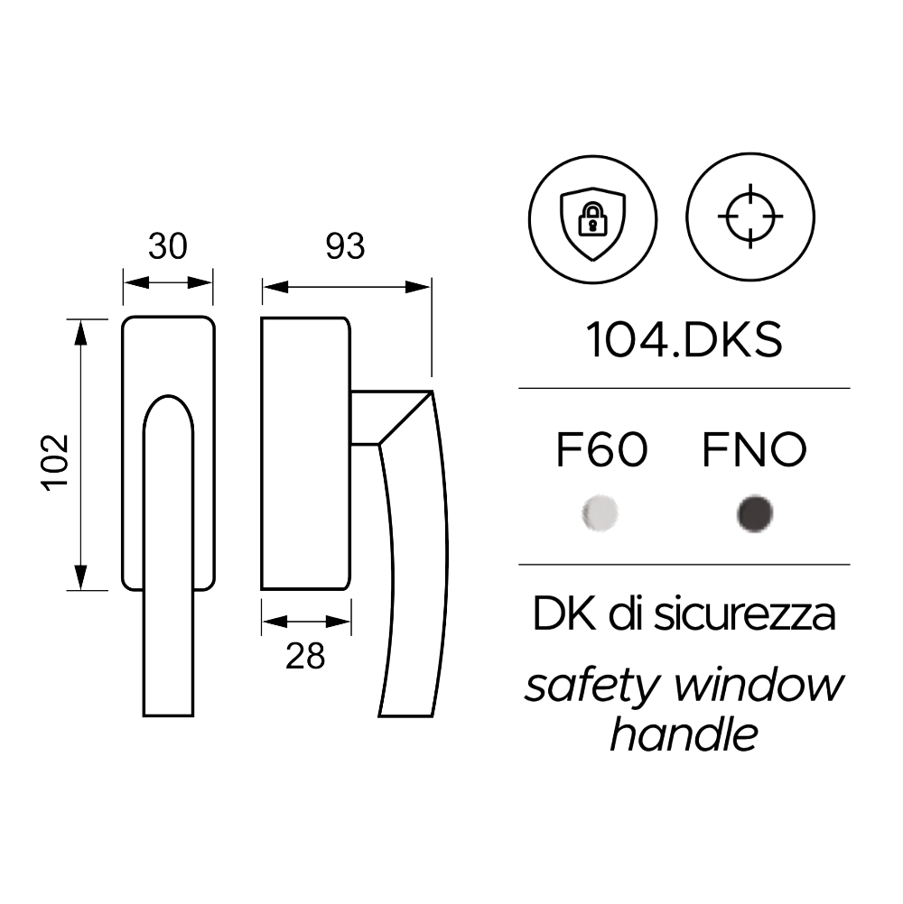 La maniglia di sicurezza Fimet Norvegia 104/DKS per finestra è la soluzione ideale per chi desidera coniugare il design moderno della serie Norvegia a un elevato standard di protezione. Realizzata in robusto Acciaio Inox AISI 304, questo modello è equipaggiato con un meccanismo di sicurezza a chiave che blocca l'apertura del serramento. Caratterizzata da una base imponente da 30x102 mm e dal classico movimento a 4 scatti, garantisce estetica, funzionalità e tranquillità, tutto rigorosamente Made in Italy.