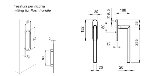 Per quanto riguarda invece le proporzioni strutturali, i disegni tecnici mostrano chiaramente misure imponenti. Innanzitutto, l'impugnatura principale vanta una lunghezza di 255 mm con un diametro di 20 mm. Allo stesso tempo, la placca di fissaggio misura 32 mm in larghezza e 152 mm in altezza, con uno spessore di 12 mm. Inoltre, l'interasse di fissaggio tra i perni è standard a 80 mm. Di conseguenza, la struttura garantisce una leva potente e una stabilità meccanica superiore durante la manovra di alzata e scorrimento. Parallelamente, le finiture Inox Satinato (F60) e Nero Opaco (FNO) mantengono un'eleganza estetica costante nel tempo.