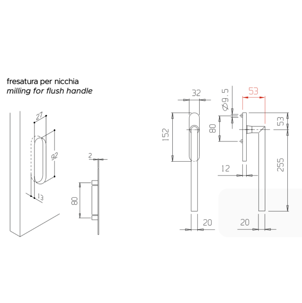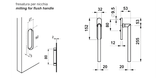 In merito alla flessibilità applicativa, d'altra parte, la gamma offre diverse configurazioni dettagliate nelle tabelle tecniche. Innanzitutto, si può optare per versioni senza foro o con foro cilindro. Oltre a ciò, la particolarità di questa serie risiede nella possibilità di abbinare il maniglione esterno a una nicchia incassata, ideale per minimizzare l'ingombro esterno dell'anta quando è aperta. Per l'installazione della nicchia, è necessaria una fresatura specifica di 27x92 mm con profondità 13 mm. Sono disponibili anche kit in coppia per una soluzione completa interno/esterno.