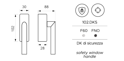 Per quanto riguarda invece la componente tecnica, l'elemento distintivo del modello 102/DKS è senza dubbio la presenza della serratura con chiave di sicurezza. Questo meccanismo permette di bloccare la rotazione della maniglia, impedendo aperture accidentali o tentativi di effrazione dall'esterno. Allo stesso tempo, il sistema mantiene il fluido movimento a 4 scatti che caratterizza la produzione Fimet. Il corpo della maniglia presenta un'altezza totale di 102 mm e una larghezza della base di 30 mm, garantendo una presenza visiva solida ma discreta sul profilo della finestra.