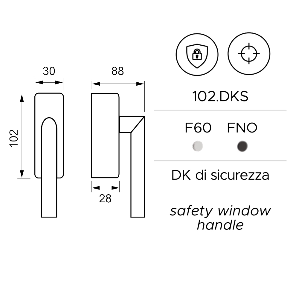 Per quanto riguarda invece la componente tecnica, l’elemento distintivo del modello 102/DKS è senza dubbio la presenza della serratura con chiave di sicurezza. Questo meccanismo permette di bloccare la rotazione della maniglia, impedendo aperture accidentali o tentativi di effrazione dall’esterno. Allo stesso tempo, il sistema mantiene il fluido movimento a 4 scatti che caratterizza la produzione Fimet. Il corpo della maniglia presenta un’altezza totale di 102 mm e una larghezza della base di 30 mm, garantendo una presenza visiva solida ma discreta sul profilo della finestra.
