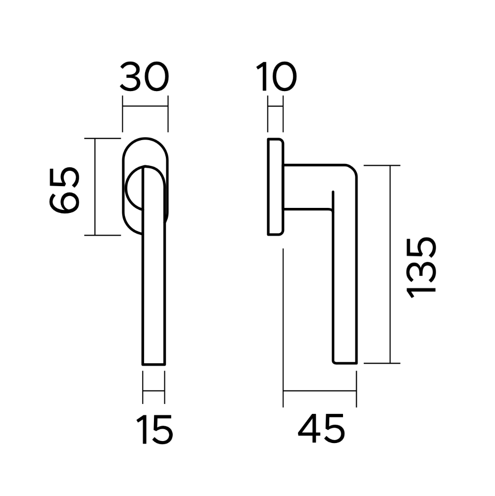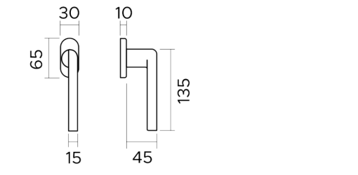 In merito alle proporzioni strutturali, il disegno tecnico allegato specifica chiaramente un'impugnatura lunga 135 mm. Allo stesso tempo, la sporgenza totale (proiezione) misura esattamente 45 mm, un dato che conferma la compattezza e l'eleganza del profilo. Oltre a ciò, la particolarità di questa versione risiede nella sua rosetta ovale, larga 30 mm e alta 65 mm. Tale geometria sottile permette un'installazione armoniosa su qualsiasi tipo di infisso moderno. Parallelamente, lo spessore della rosetta è di 10 mm, mentre la larghezza della leva alla base misura 15 mm, garantendo un'ergonomia di presa eccellente.
