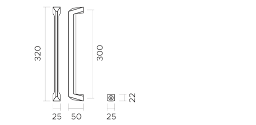 Per quanto riguarda invece le proporzioni strutturali, lo schema tecnico mostra chiaramente un'altezza totale di 320 mm. Allo stesso tempo, l'interasse tra i fori di fissaggio misura esattamente 300 mm, garantendo una distribuzione del carico ottimale sulla superficie della porta. Oltre a ciò, la particolarità di questa versione risiede nella sua sezione quadrata, con una larghezza frontale di 25 mm e una profondità del corpo di 22 mm. Tale geometria bilanciata permette un'impugnatura solida e confortevole. Inoltre, la sporgenza totale (proiezione) è di 50 mm, offrendo uno spazio adeguato per il passaggio della mano.