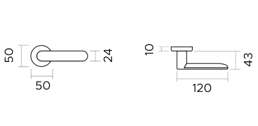 Per quanto riguarda invece le proporzioni strutturali, il disegno tecnico mostra chiaramente un'impugnatura lunga 120 mm. Allo stesso tempo, la sporgenza totale (proiezione) misura esattamente 43 mm, mentre lo spessore della leva è di 10 mm. Oltre a ciò, la particolarità di questa versione risiede nella sua rosetta tonda, caratterizzata da un diametro di 50 mm. Tale geometria pulita permette un'installazione esteticamente impeccabile su serramenti di diverso spessore. Inoltre, la maniglia è dotata di un'innovativa rosetta clip con sottorosetta in plastica (PVC). Parallelamente, questo sistema di montaggio risulta rapido, preciso e capace di preservare l'integrità della superficie della porta nel tempo.
