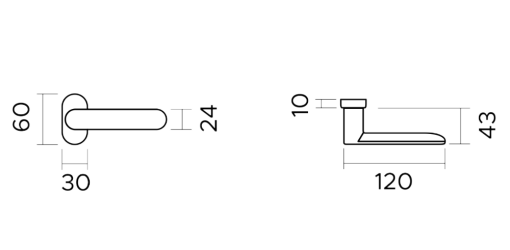 Per quanto riguarda invece le proporzioni strutturali, il disegno tecnico mostra chiaramente un'impugnatura lunga 120 mm. Allo stesso tempo, la sporgenza totale (proiezione) misura esattamente 43 mm, mentre lo spessore della leva è di 10 mm. Oltre a ciò, la particolarità di questa versione risiede nella geometria della sua base, larga 30 mm e alta 60 mm. Tale proporzione sottile permette un fissaggio agevole anche su superfici verticali limitate. Inoltre, la costruzione integrale in Alluminio garantisce una maneggevolezza superiore e una resistenza ottimale nel tempo. Pertanto, la maniglia assicura una durabilità eccezionale pur mantenendo un peso strutturale ridotto. D'altra parte, le numerose finiture disponibili, come il Nero Opaco (FNO) o l'Effetto Ottone Satinato (F02O), permettono una personalizzazione estetica costante e raffinata.