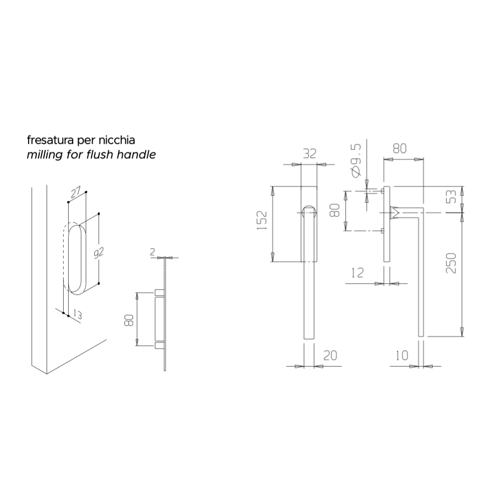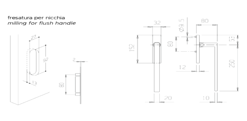 - Dimensioni Maniglia a incasso (esterna): Altezza 152 mm | Larghezza 32 mm